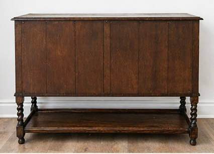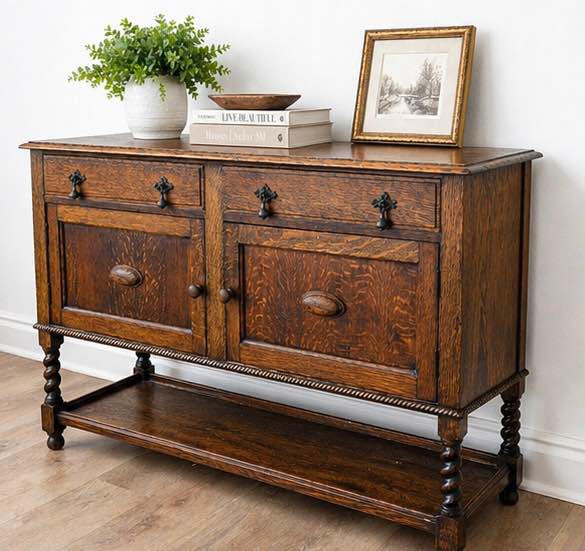 Beautiful vintage oak buffet/server featuring barley twist legs, paneled cabinet doors, roomy drawers, lower shelf, and rich tiger oak grain. Approximate Measurements * Width: 48” * Depth: 17” * Height: 37”