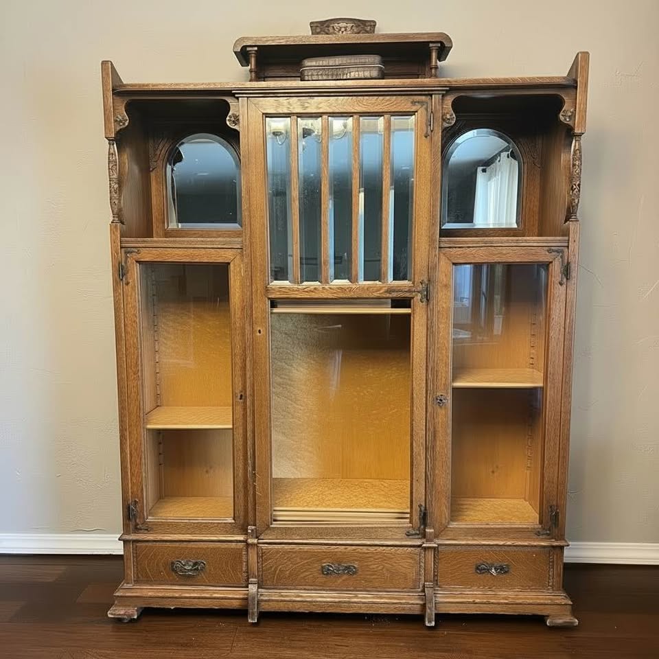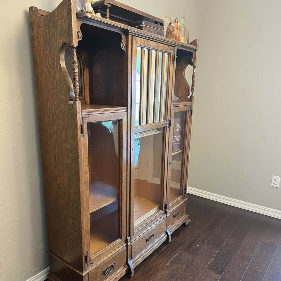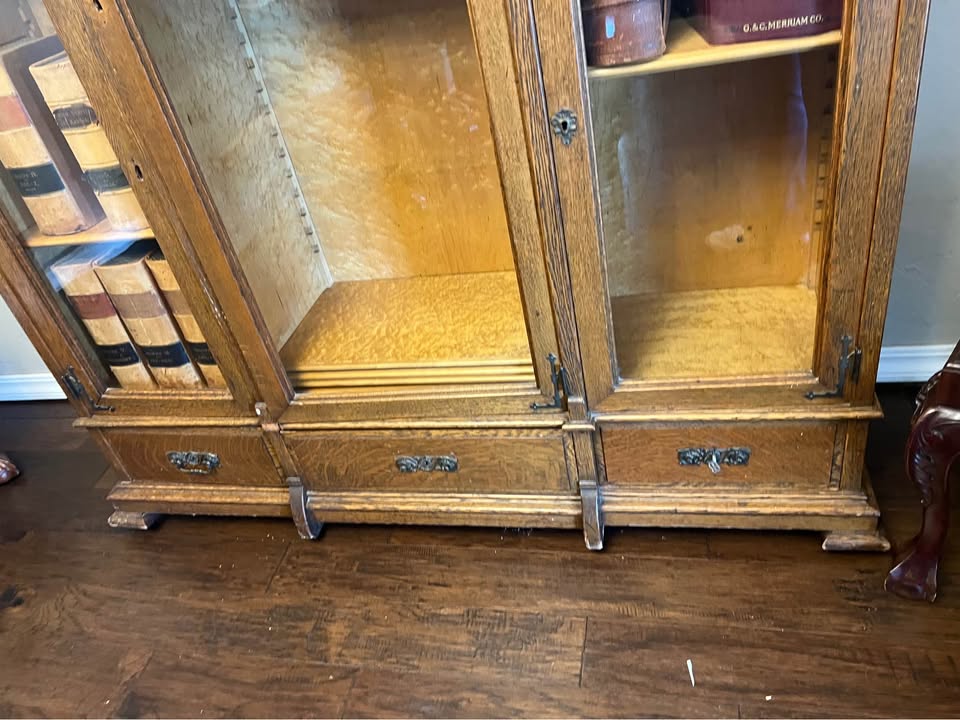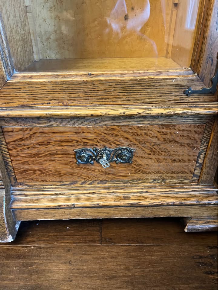 Decor style: Craftsman & mission Band colour: Brown Time period: 1900-1909 Beautiful antique quarter sawn oak cabinet featuring stunning tiger grain, original hardware, and glass display doors. Classic Arts & Crafts / Mission style with decorative side arches, vertical slat detail, and three lower drawers. Approx. Dimensions: • Height: ~5’10” • Width: ~4’7” • Depth: ~12”