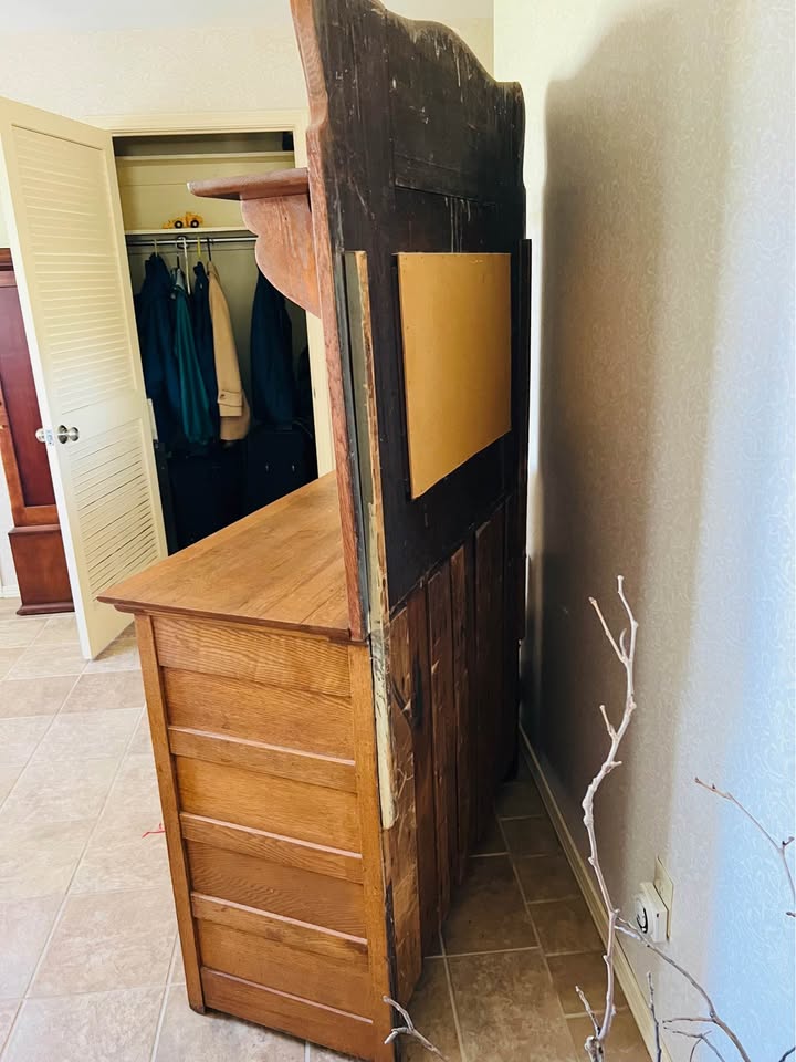 Material: Oak Timeless character meets functional beauty. This early 20th-century solid oak sideboard with original mirror hutch is a striking example of American Craftsman / late Victorian transition design (circa 1900–1920). Featuring rich quarter-sawn oak grain, hand-carved shell motifs, and original brass hardware, this piece carries both history and presence. The upper hutch showcases a beautifully framed mirror with sculptural detailing and display shelf, while the base offers three drawers and dual cabinet storage, perfect for dining, entryway styling, or a statement bar setup. ✨ Details: • Solid oak construction (no veneer on main structure) • Hand-carved decorative panels and crest • Original antique brass pulls • Mirror hutch top with display shelf • Dovetail drawer construction (visible craftsmanship) • Warm honey oak patina developed over decades ✨ Condition: • Structurally solid and heavy • Age-appropriate wear on interior/back (see photos) • Minor cosmetic imperfections consistent with antique use • Drawers and doors function well This is a true antique, not reproduction — ideal for collectors, designers, or anyone wanting a standout heirloom piece. ⸻ Time Era / Style Identification • Circa: 1900–1920 • Style: American Craftsman with Victorian influence • Wood: Likely quarter-sawn oak (visible grain pattern confirms) Measurements 6 ft tall x 20 in deep x 42 in wide