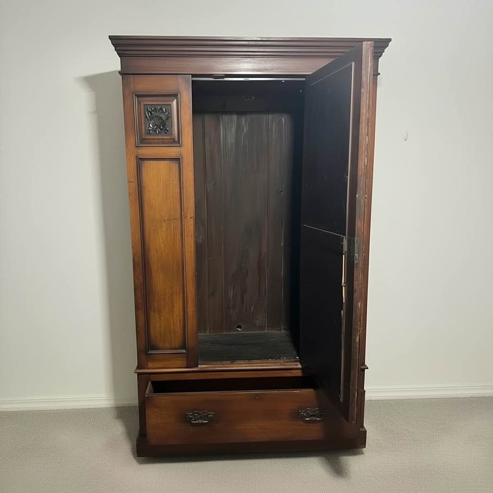 Decor style: Traditional Elegant solid wood armoire wardrobe with a full-length mirror, carved decorative panels, and a large bottom drawer. Offers great storage with hanging space inside. Beautiful warm wood tone and classic craftsmanship—perfect for bedroom storage or as a statement piece. Dimensions: • Height: 6’5” (77”) • Width: 4’ (48”) • Depth: 20”