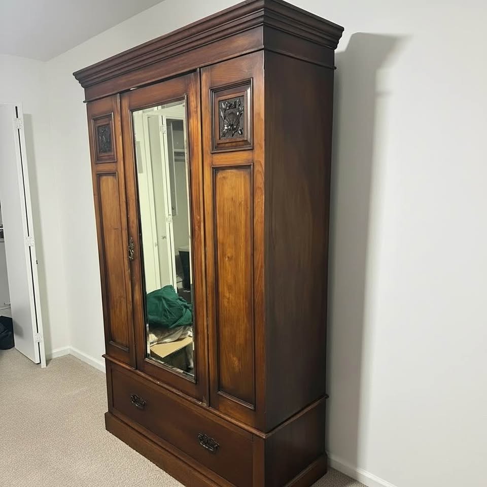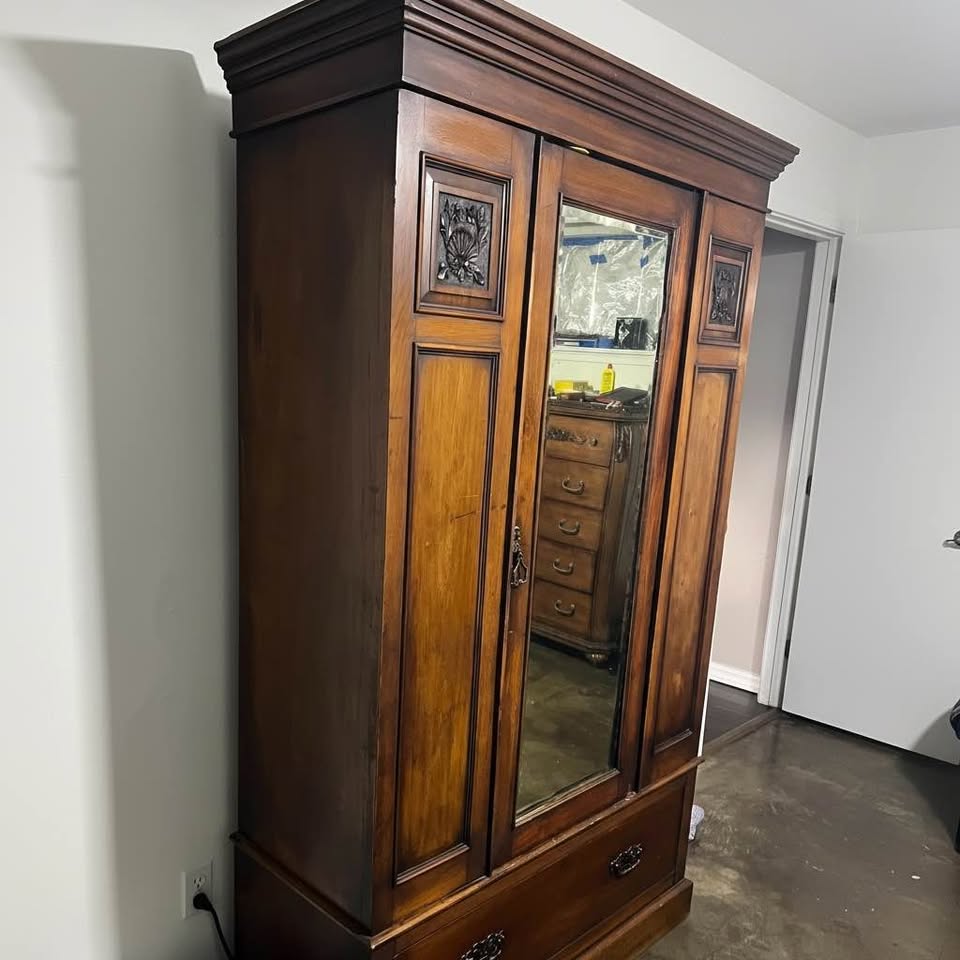 Antique Solid Wood Armoire Wardrobe w/ Mirror & Drawer – 1930s