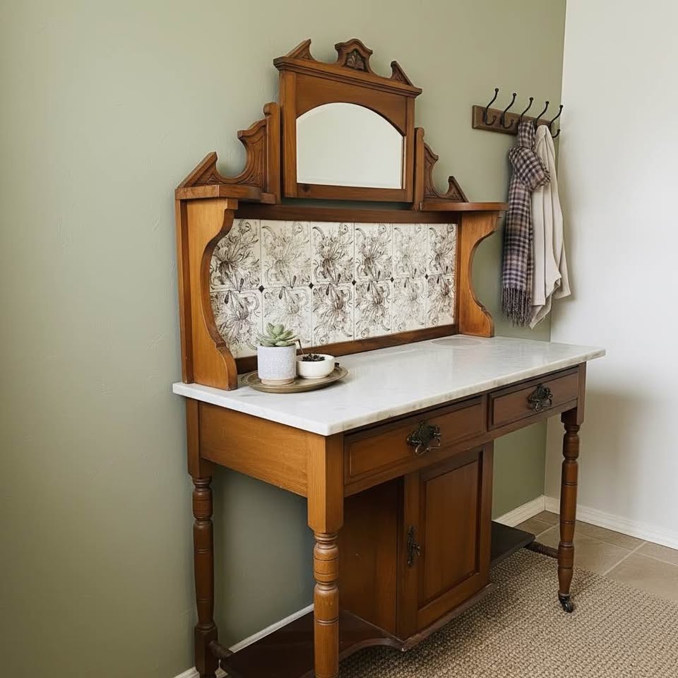 Decor style: Victorian Time period: 1800-1899 A truly exceptional late Victorian marble-top washstand, curated for those who appreciate timeless craftsmanship and rare architectural detail. This piece features an original hand-set ceramic tile backsplash with intricate floral transferwork, framed by a sculptural solid wood gallery and crowned with an elegant arched mirror. The natural marble top adds a refined, luminous surface that beautifully contrasts the warm patina of the wood. Originally crafted in the late 19th century, this washstand embodies the transition into refined indoor living—today, it serves as a striking designer vanity, entry console, or focal accent piece. Design Highlights: • Authentic solid wood construction with rich aged patina • Original marble slab top – highly sought after and increasingly rare • Decorative Victorian floral tilework backsplash (intact and beautifully preserved) • Sculpted gallery with integrated mirror and carved cresting • Two drawers with ornate pulls + lower cabinet storage • Turned legs with original casters for subtle mobility • Elegant proportions ideal for curated interiors ⸻ Condition Beautifully preserved antique condition. Light, age-appropriate wear enhances its character. Marble, tiles, and mirror remain intact—ready to display and use. ⸻ Era & Provenance Circa 1880–1910 (Victorian / Early Edwardian) Originally a washstand used before modern plumbing—now reimagined as a collectible statement piece with both history and function. SERIOUS INQUIRY ONLY. Secure it ji before it’s gone. Measurements Table 42 in long x 19 in deep x 30 in tall Splash guard tile wall is 30 in tall. Overall 60 in or 5 ft tall