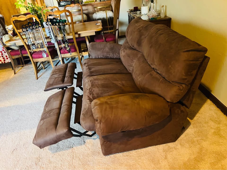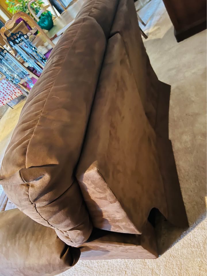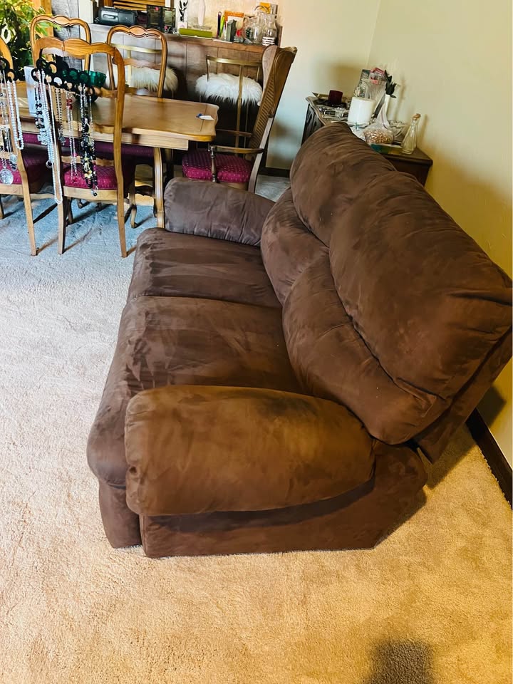 Sofa type: Love Seat Material suede fabric. Manual recliner. Size 6ft 7in long x 33in deep x 33in tall Seat is 20in deep