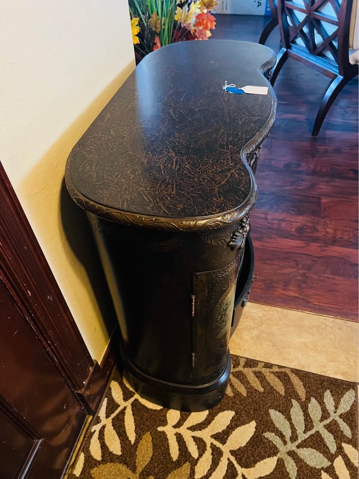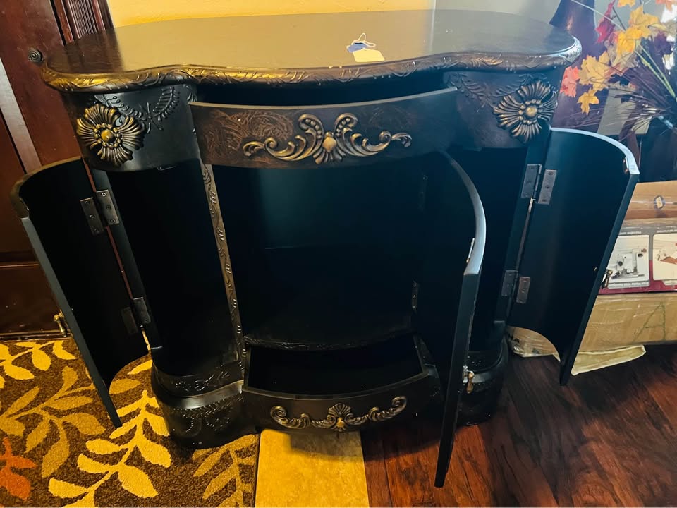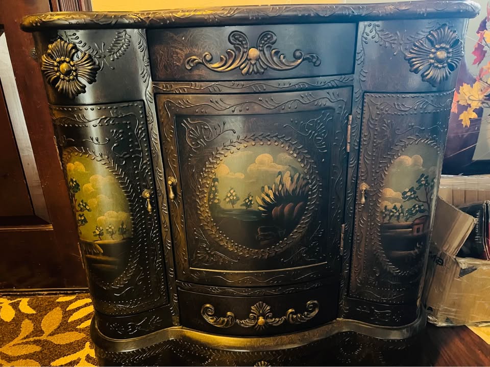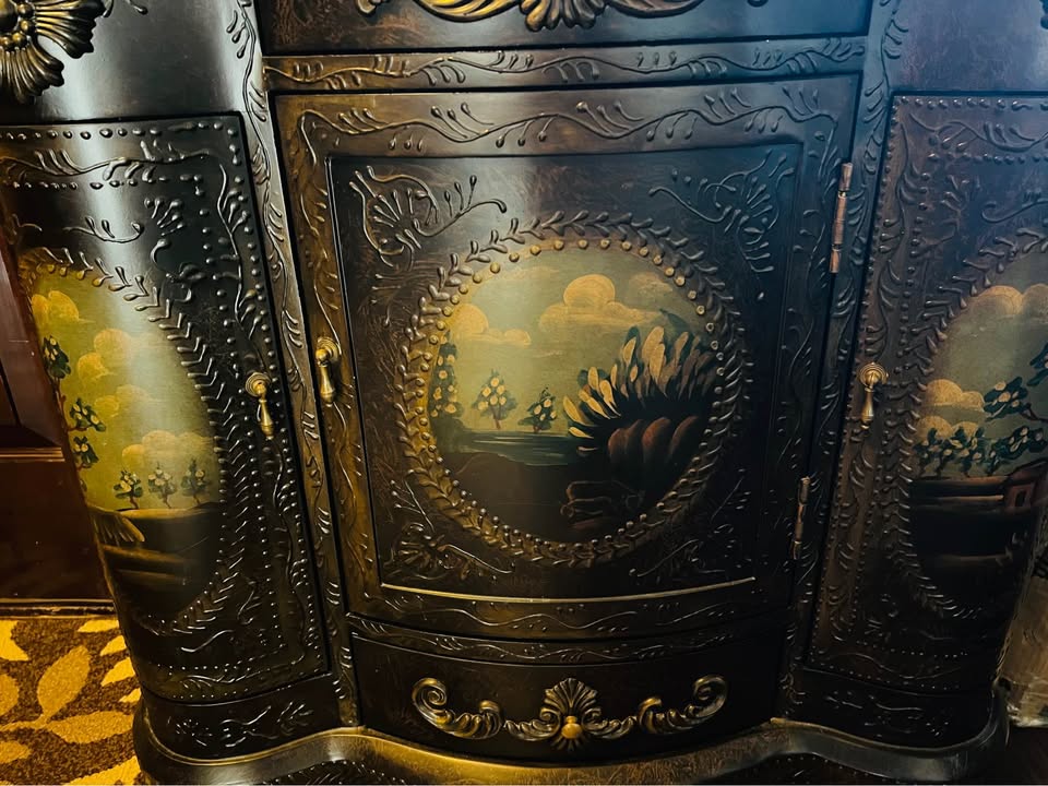 Decor Style: French Country Beautiful French Style Bombe Cabinet with Hand Painted Doors with ornate drawers. Size 27 in wide x 30 in tall x 13 in deep