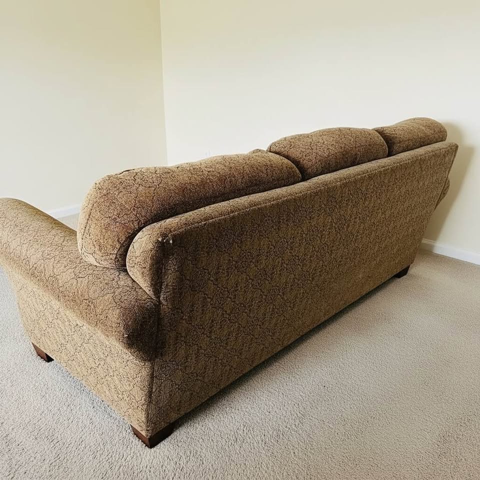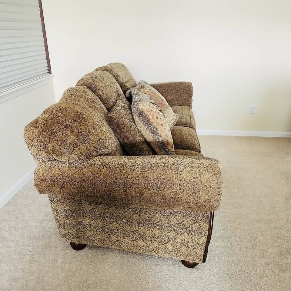 Sofa type: Sofa Decor style: Traditional Comfortable and well-built Lane Upholstery sofa with solid wood trim and classic design. Features supportive cushions, durable patterned fabric, and includes matching accent pillows. Clean and in good condition with normal wear. Sturdy frame and very comfortable—great for living room or guest space. Smoke free, pet free. Measurements 7 ft long x 40in deep x 36 in tall. Seat 18in from ground.