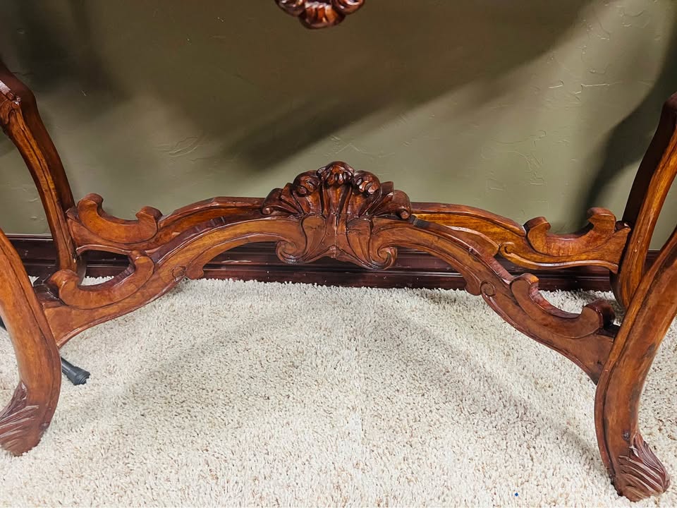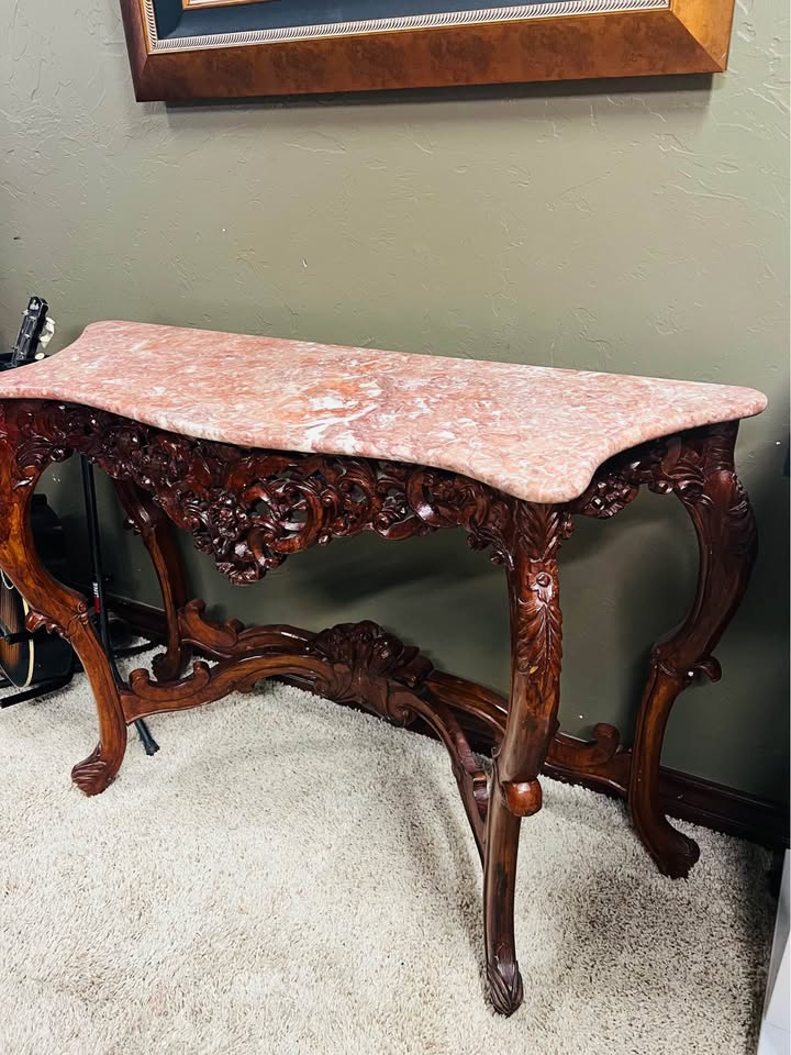 Beautiful, highly detailed ornate console table featuring an elegant pink marble stone top and hand-carved solid wood base. This piece showcases dramatic scrolling, floral motifs, and cabriole legs—very much Rococo / Victorian revival style. Perfect as: • Entryway or foyer table • Sofa table • Hallway accent • Statement display for art or décor Details: • Solid wood construction with deep, intricate carvings • Genuine pink marble top with natural veining • Rich warm wood finish • Sturdy and well-balanced • Classic European-inspired design Condition: Very good overall condition. Normal age-appropriate wear. No cracks in the marble; carvings are intact and impressive. Approximate size: 46in long x 16in deep x 33in tall This is a standout statement piece that adds instant elegance and old-world charm.