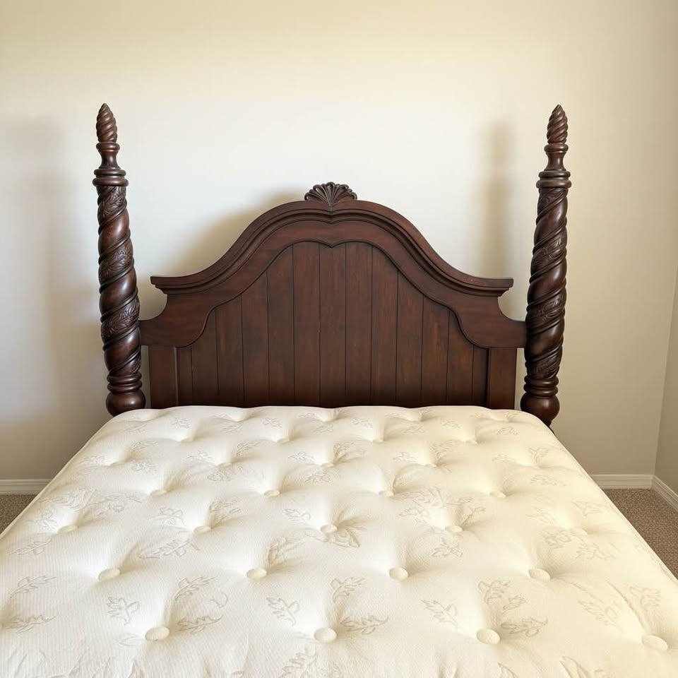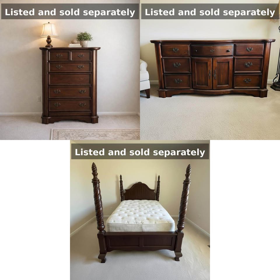 Bed size: Double Bed type: Four-poster bed Beautiful solid wood four-poster queen bed frame in a rich dark cherry finish. Features elegant spiral-carved posts and a curved headboard with classic detailing—perfect for a timeless, traditional bedroom. ✔️ Queen size ✔️ Solid wood, very sturdy ✔️ Elegant carved posts (statement piece) ✔️ Classic traditional design ✔️ Clean and well-maintained ✔️ Includes headboard, footboard, and side rails Mattress shown can be included as bonus. (Matching dresser, nightstands and chest are available but listed separately.)