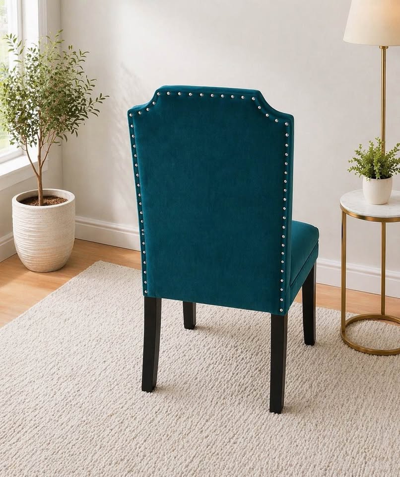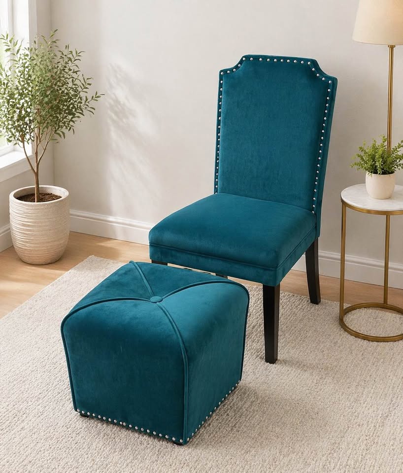 Stylish upholstered chair with nailhead trim + matching ottoman. Soft velvet, sturdy legs, great for bedroom or lounge. Chair only $50 Ottoman only $30 Both $80 as bundle