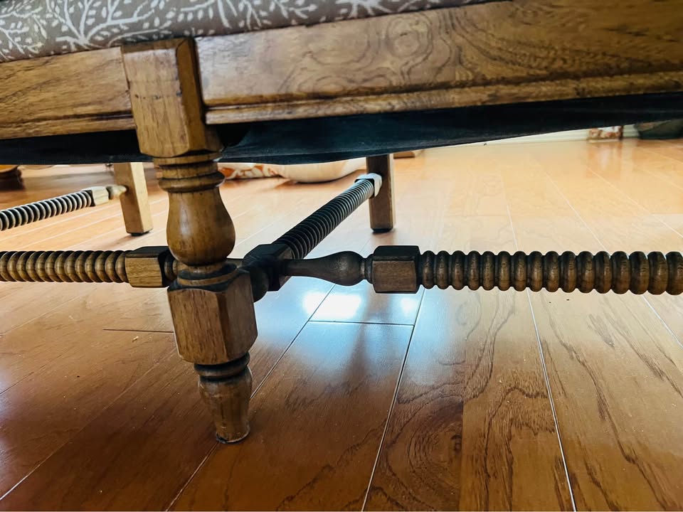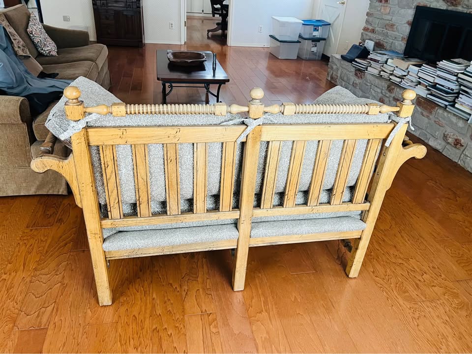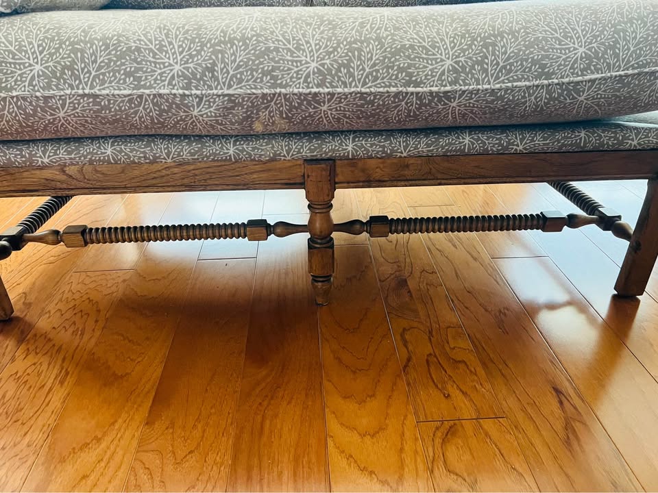 Sofa type: Love seat Decor style: Farmhouse Elevate your space with this beautifully crafted vintage Bernhardt “Flair” spindle sofa—an uncommon piece that blends classic American craftsmanship with English cottage charm. Constructed from solid wood with intricate turned spindle detailing along the arms, back, and base, this sofa has the kind of character and quality rarely found in modern furniture. The silhouette is both architectural and inviting—perfect as a statement piece in a curated living room, reading nook, or entryway. The neutral upholstered cushions soften the look and make it move-in ready, while still allowing easy customization if you want to reupholster for a designer finish. Why this piece stands out: • Authentic Bernhardt craftsmanship (Lenoir, NC) • Solid wood frame—built to last decades • Distinctive spindle design (highly sought-after vintage style) • Versatile: works in farmhouse, traditional, transitional, or collected interiors • Compact sofa size—designer look without bulky footprint Condition: Excellent vintage condition. Structurally solid with light age-appropriate wear that adds character. Cushions are clean and comfortable. Measurements Frame 6 ft long x 28 in deep x 31 in tall Seat 44 in long x 23 in deep