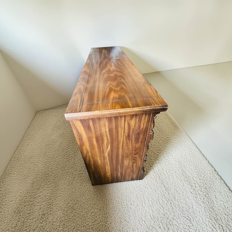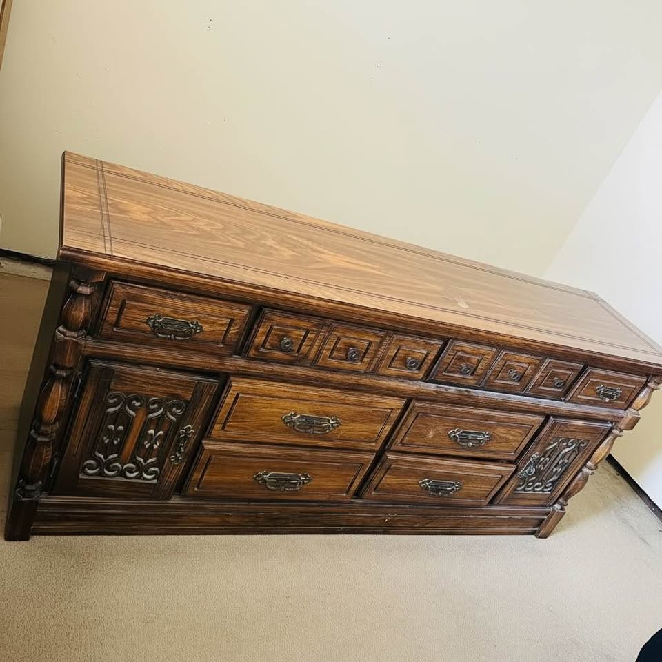 Beautiful vintage Spanish Revival / Mediterranean-style dresser crafted from solid oak with stunning natural grain throughout. This piece is featuring: • 9 dovetail drawers across the top and center • 2 side cabinets with decorative wrought iron doors • Hand-forged style iron drawer pulls and hinges The wood grain on the top is especially eye-catching, and the overall construction is very solid and heavy—built to last. Condition: Good vintage condition. Shows some wear consistent with age, including surface wear and finish fading on the top and minor imperfections (see photos). Structurally solid and some drawers slide need some work. Measurements Length 6ft Width 18in Height 32in Pickup West Edmond Cash or Venmo
