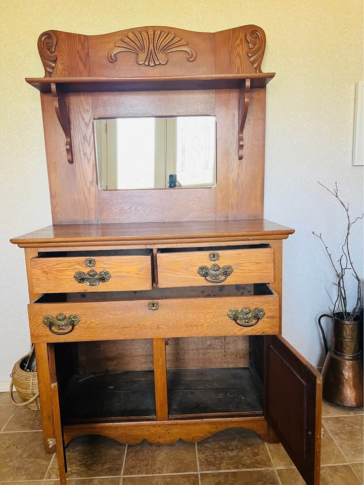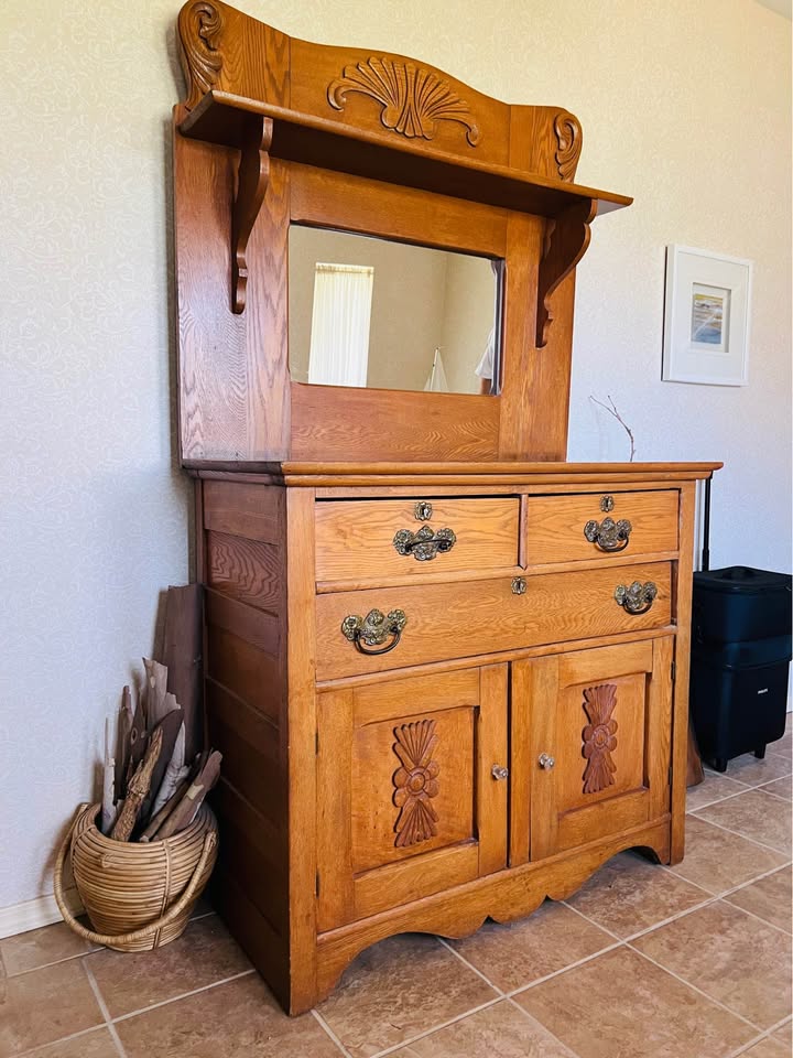 Material: Oak Timeless character meets functional beauty. This early 20th-century solid oak sideboard with original mirror hutch is a striking example of American Craftsman / late Victorian transition design (circa 1900–1920). Featuring rich quarter-sawn oak grain, hand-carved shell motifs, and original brass hardware, this piece carries both history and presence. The upper hutch showcases a beautifully framed mirror with sculptural detailing and display shelf, while the base offers three drawers and dual cabinet storage, perfect for dining, entryway styling, or a statement bar setup. ✨ Details: • Solid oak construction (no veneer on main structure) • Hand-carved decorative panels and crest • Original antique brass pulls • Mirror hutch top with display shelf • Dovetail drawer construction (visible craftsmanship) • Warm honey oak patina developed over decades ✨ Condition: • Structurally solid and heavy • Age-appropriate wear on interior/back (see photos) • Minor cosmetic imperfections consistent with antique use • Drawers and doors function well This is a true antique, not reproduction — ideal for collectors, designers, or anyone wanting a standout heirloom piece. ⸻ Time Era / Style Identification • Circa: 1900–1920 • Style: American Craftsman with Victorian influence • Wood: Likely quarter-sawn oak (visible grain pattern confirms) Measurements 6 ft tall x 20 in deep x 42 in wide