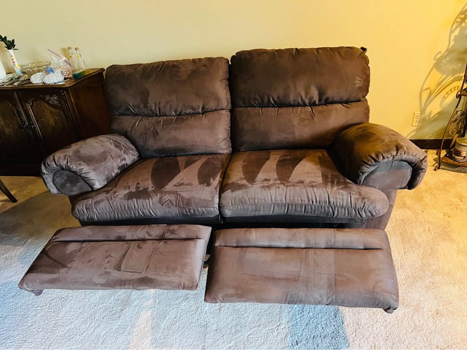 Sofa type: Love Seat Material suede fabric. Manual recliner. Size 6ft 7in long x 33in deep x 33in tall Seat is 20in deep