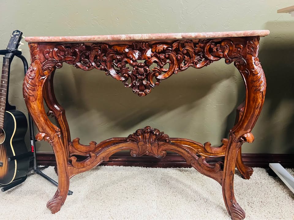 Beautiful, highly detailed ornate console table featuring an elegant pink marble stone top and hand-carved solid wood base. This piece showcases dramatic scrolling, floral motifs, and cabriole legs—very much Rococo / Victorian revival style. Perfect as: • Entryway or foyer table • Sofa table • Hallway accent • Statement display for art or décor Details: • Solid wood construction with deep, intricate carvings • Genuine pink marble top with natural veining • Rich warm wood finish • Sturdy and well-balanced • Classic European-inspired design Condition: Very good overall condition. Normal age-appropriate wear. No cracks in the marble; carvings are intact and impressive. Approximate size: 46in long x 16in deep x 33in tall This is a standout statement piece that adds instant elegance and old-world charm.