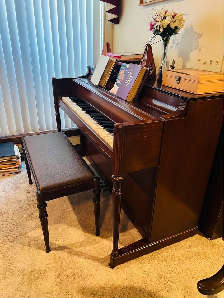 Beautiful vintage Elburn upright piano in a rich dark wood finish. This is a classic, well-built piece with elegant detailing and comes with the matching padded bench. • Brand: Elburn • Type: Upright piano • Finish: Dark wood (mahogany tone) • Includes: Bench • Condition: Good cosmetic condition overall • Keys: All present • Needs tuning (has not been tuned recently) This would make a great decorative statement piece, beginner project piano, or restoration opportunity. The wood cabinet is in nice shape with minor wear consistent with age. Perfect for: • Home décor / staging • Beginner player willing to tune/restore • Repurpose projects (bars, desks, etc.) Important: Buyer must arrange pickup and moving (it is heavy). Priced to sell – need gone Pickup the Village OKC Cash or venmo