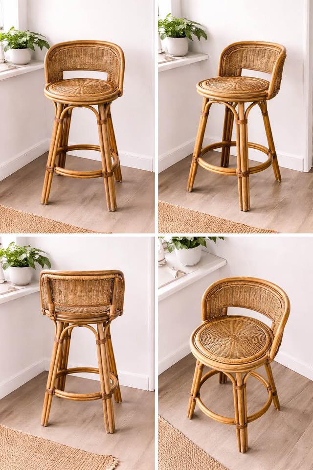 Vintage Rattan Bar Stool with Backrest – Boho Coastal Bamboo Style (Non-Swivel)